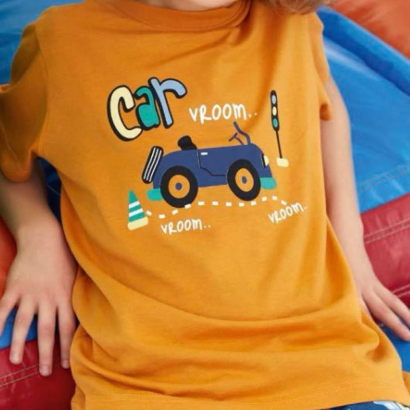Children's 100% cotton pajama, short sleeve orange t-shirt with front print and round neck, blue patterned long pants, elastic waist and orange trim. Regular fit.